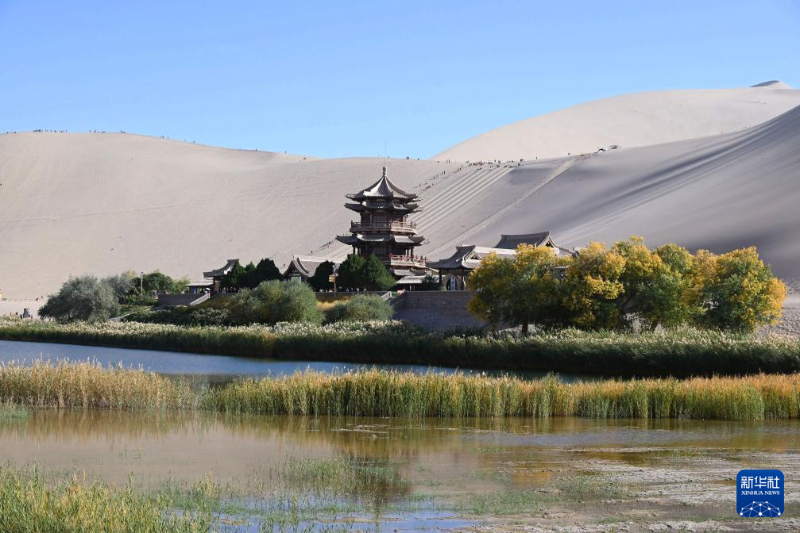 金秋时节,甘肃省敦煌市鸣沙山月牙泉景区景色如画,众多游客徜徉其中,感受大漠风情。