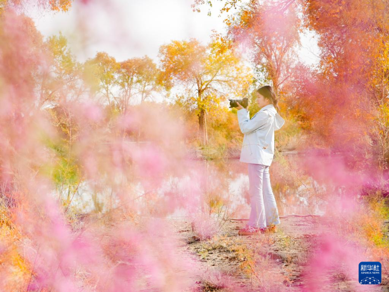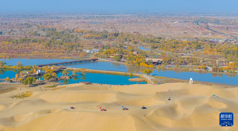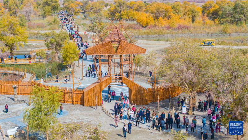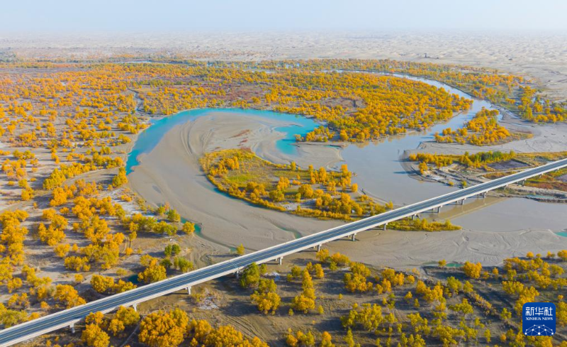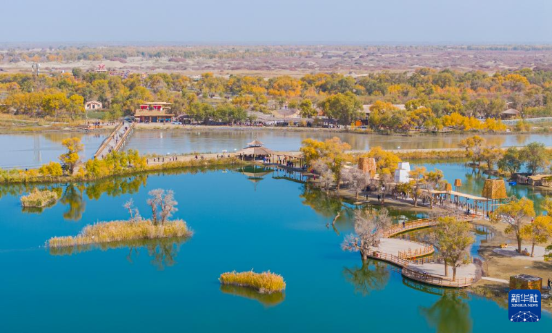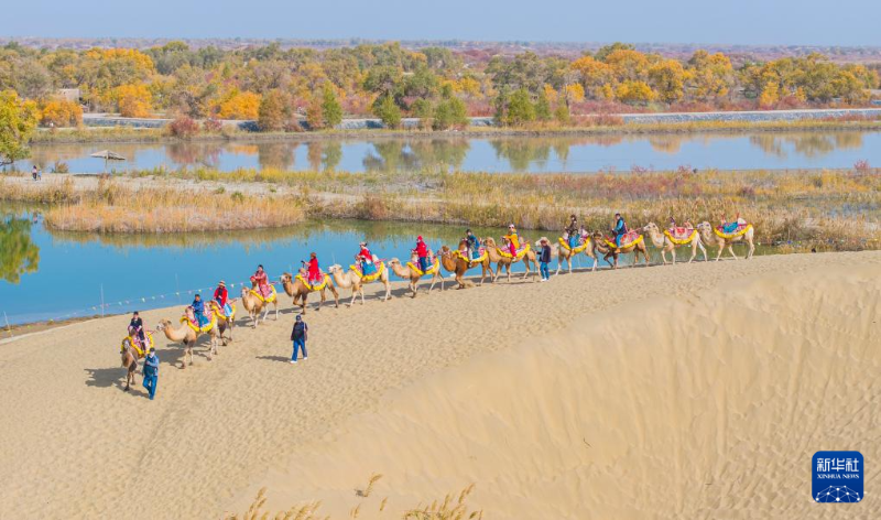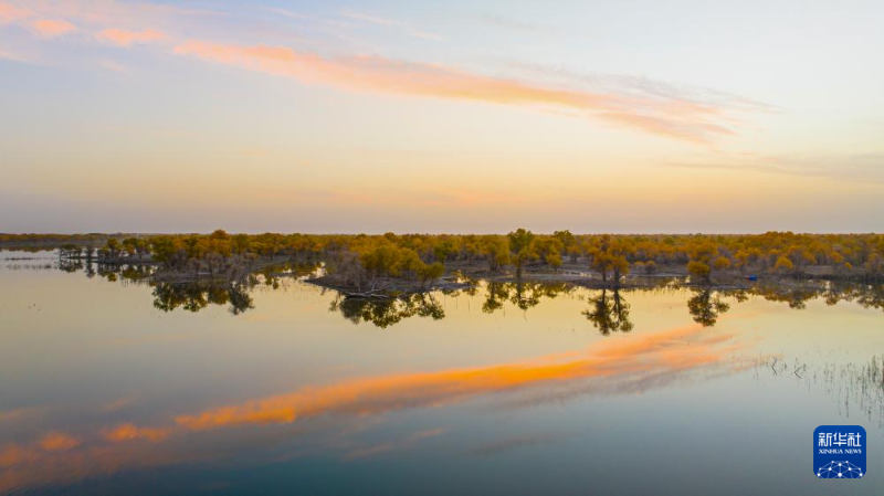 郭楞蒙古自治州尉犁县境内的沙漠胡杨景观与塔里木河互相映衬,美不胜收,吸引不少游客观光游览。